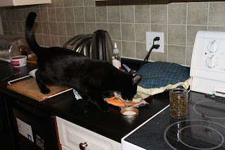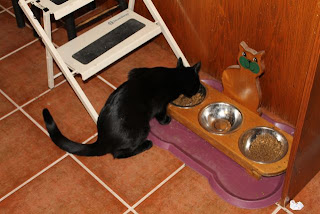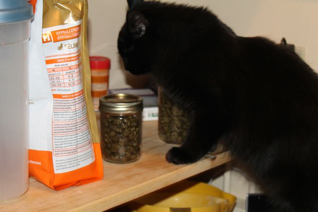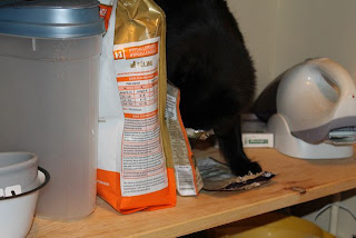 We had a cat that would open his own dry food bags if we left them out. Stick Tail is so spoiled he waits to be fed. He heads for the "food bar" in the dining room and lies there until something arrives. That is unless there is butter on the table before dinner. That is too hard to resist. - Margy