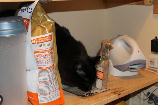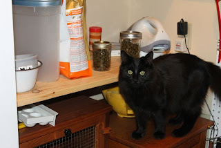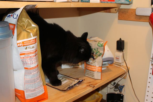 I heard a strange noise coming from the pantry, where the cat food and treats are safely stored. Yes, again, I forgot to close the door.
