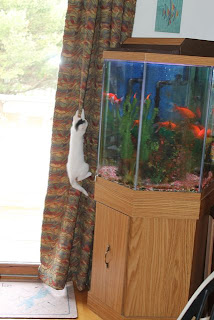 Awwwww, I love cats. And they all seem to be after the fish in the tank? PURRfect climbers.