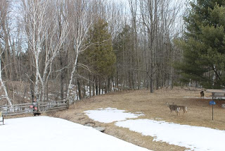 The other day, with the snow melting, Buster was looking for the field mice on top of the septic system! I saw him walking directly towards the deer.