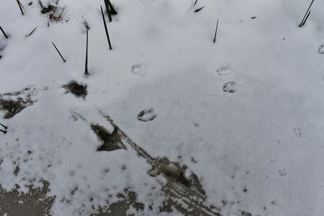 I found deer tracks every where. Including a spot of blood on the snow in our backyard, on the Honourary Rick Wilson Grassy Knoll. Rather ironic. A potential kill, not quite killed.The dratted turkeys had been walking across the pond. The deer, as well.