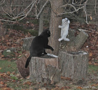 Hubby was out getting the newspaper across the highway. Daisy followed him, and waited at the end of the driveway. Daisy and Buster both cross, usually looking and listening both ways before they cross. Buster came up behind her and they both ran across the street. A car slowed, seeing hubby there, or one or both cats would have been killed. This behaviour is escalating. He chased Dorah in the yard, and has done so on walks. Roaring over and rolling in the leaves with her.Nov.6th