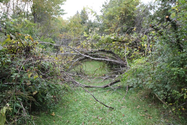 The path has suffered wind damage from storms. Most of it was cleaned up. I crawled through this with the backpack on! These are young dead elm trees, with wild grapes weighing them down.