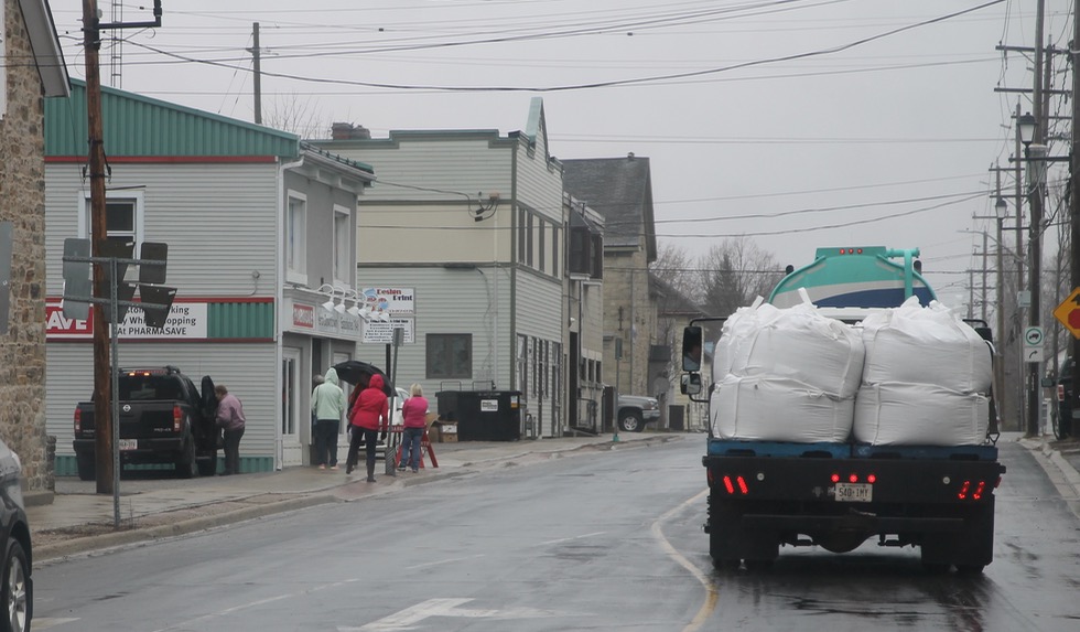 Here are people lining up outside our downtown drug store, in the rain.