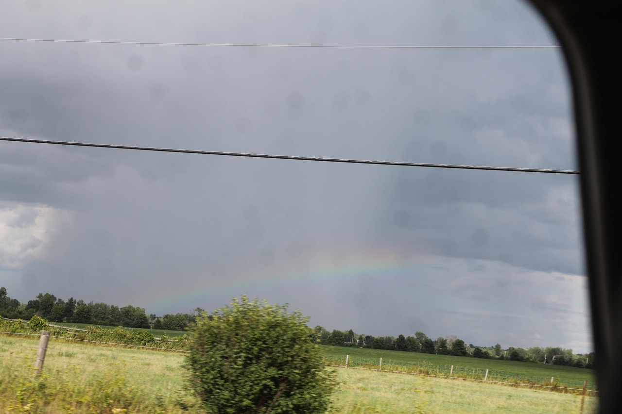 I glanced out the back, rear window, and saw a rainbow! JB lowered the window for me, and grabbed proof.