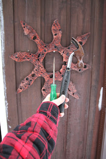 First I had to brush off the snow. I had several tools, but used the hacksaw to cut off the nail. That worked. Except, there was a hex bolt of some sort, a third attachment for which I was unprepared. I had forgotten how I'd attached it! Back up to the house. A shower and feet up ensued.