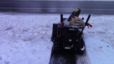The slush mucks up the chute, and the auger cannot move the snowy slush. I had to be careful. It's a great machine, but to turn, you put on one brake. That doesn't work if the one wheel is sliding on the ice! I persevered. JB brought me water in the garage, and suggested I take a break, but I couldn't face it later. Beside, it was only going to go from 1 C. up to 5 C., and it would get worse as it melted and got heavier.