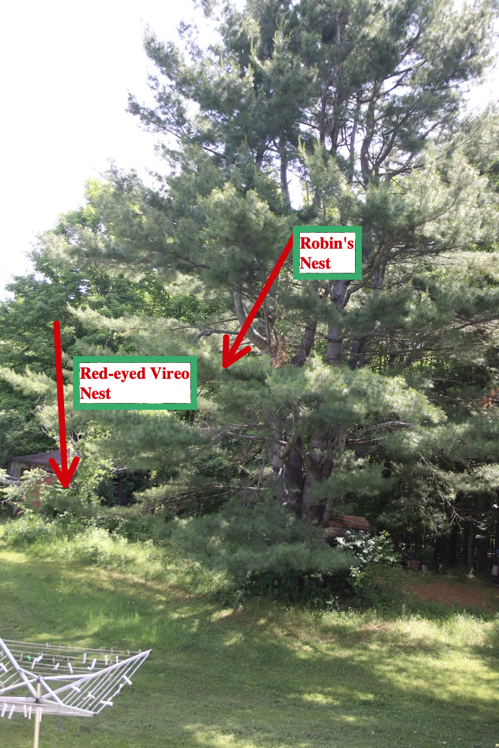 🪺This is my non-mental note, there are two nests in the tree. I found the Red-eyed Vireo nest when I accidentally flushed momma from the nest. Next, I could hear the baby Robins shrieking for food.